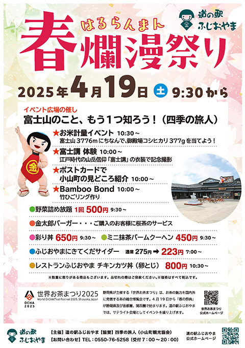2025年4月13日 『春爛漫祭り』開催のお知らせ 2025年4月19日(土)9:30から道の駅ふじおやまで『春爛漫祭り』が開催されます。イベント広場では、大人気のお米計量イベント、野菜詰め放題、ポストカード無料配布、竹ひごリング作りなどが行なわれます。 是非、遊びに来てください。 【主催】道の駅ふじおやま 【お問合せ】電話 0550-76-5258(受付 7:00~20:00) 次の記事へ 前の記事へ