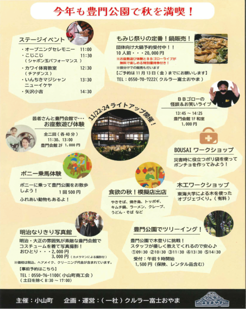 2025年11月11日 『豊門公園もみじまつり』開催のお知らせ 今年も豊門公園で秋を満喫しましょう!!ご来場お待ちしております! 【日時】2025年11月22日(土)11:00~15:00 【場所】豊門公園 ※雨天時は成美小学校体育館 【内容】ステージイベント 鍋販売 お座敷遊び体験 ポニー乗馬体験 明治なりきり写真館 ワーックショップ 模擬店他 11/22~24ライトアップ開催! 【駐車場】小山町役場 【主催】小山町 【企画・運営】(一社)クルラー富士おやま 次の記事へ 前の記事へ