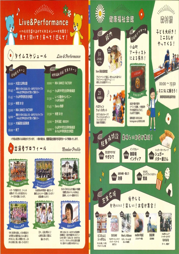 - 役場前と健康福祉会館芝生ステージで太鼓演奏、音楽演奏、ダンス演奏等