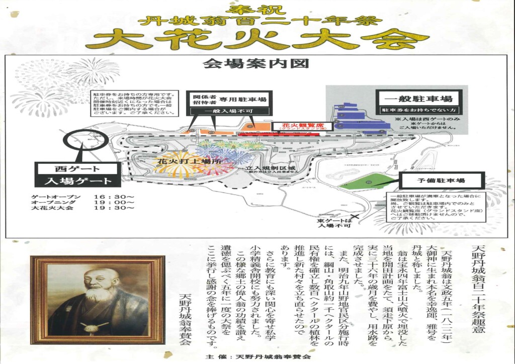 - 大御神丹城翁の大花火大会は5年に一度開催される花火大会です。地域の発展に寄与した『天野丹城翁』の功績を称える花火大会で、今年は120年祭となります。