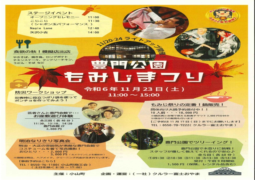 • 豊門公園もみじまつりが今年も開催されます。色々な催し物があります。イベントや美味しいもの、そして紅葉を楽しみながら秋の一日を豊門公園でお過ごしください。