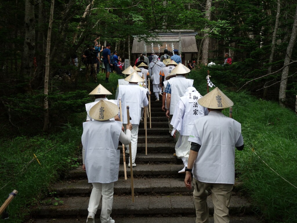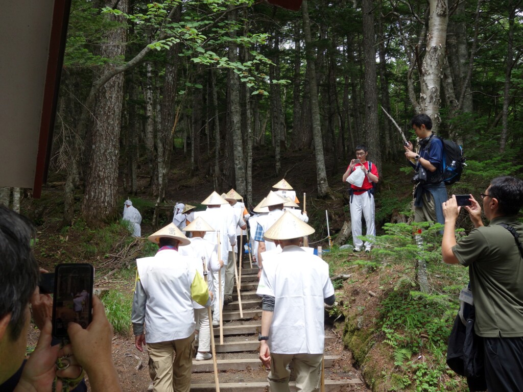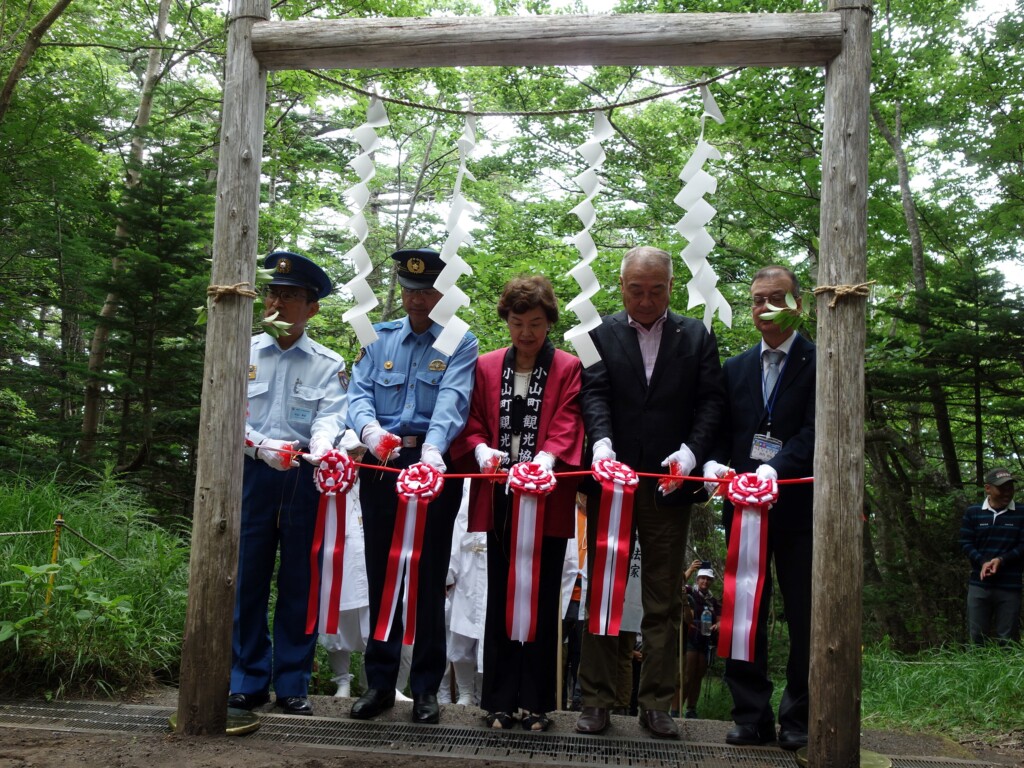 - 開通式前に、石橋冨士浅間神社宮司を先頭に、出席者は富士講姿のインフォメーションセンター職員、観光協会員らと六根清浄を唱えながら、古御嶽神社まで約200メートルを登拝しました。