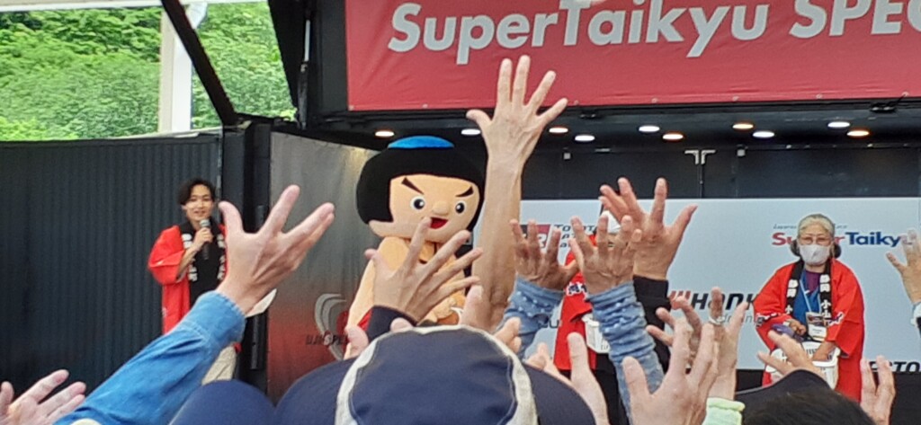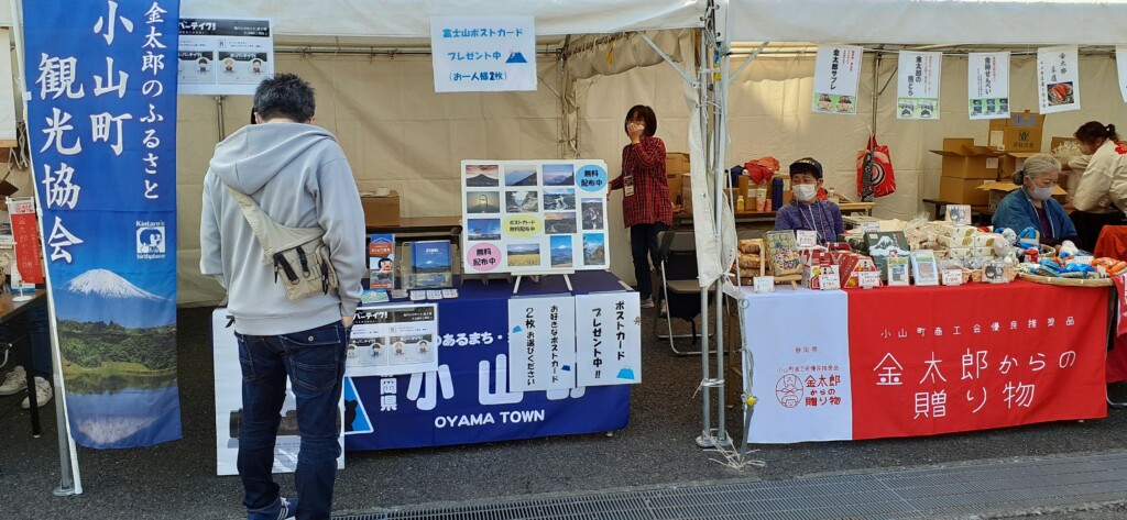 - ブースもたくさん出ていて、ステージイベントも色々行われました。小山町からは、小山高校吹奏楽部による演奏、民謡愛好会による民謡と踊り、大富士公時太鼓による太鼓演奏、金太郎による餅まきなど。夜には花火も上がり、レースを盛り上げていました。