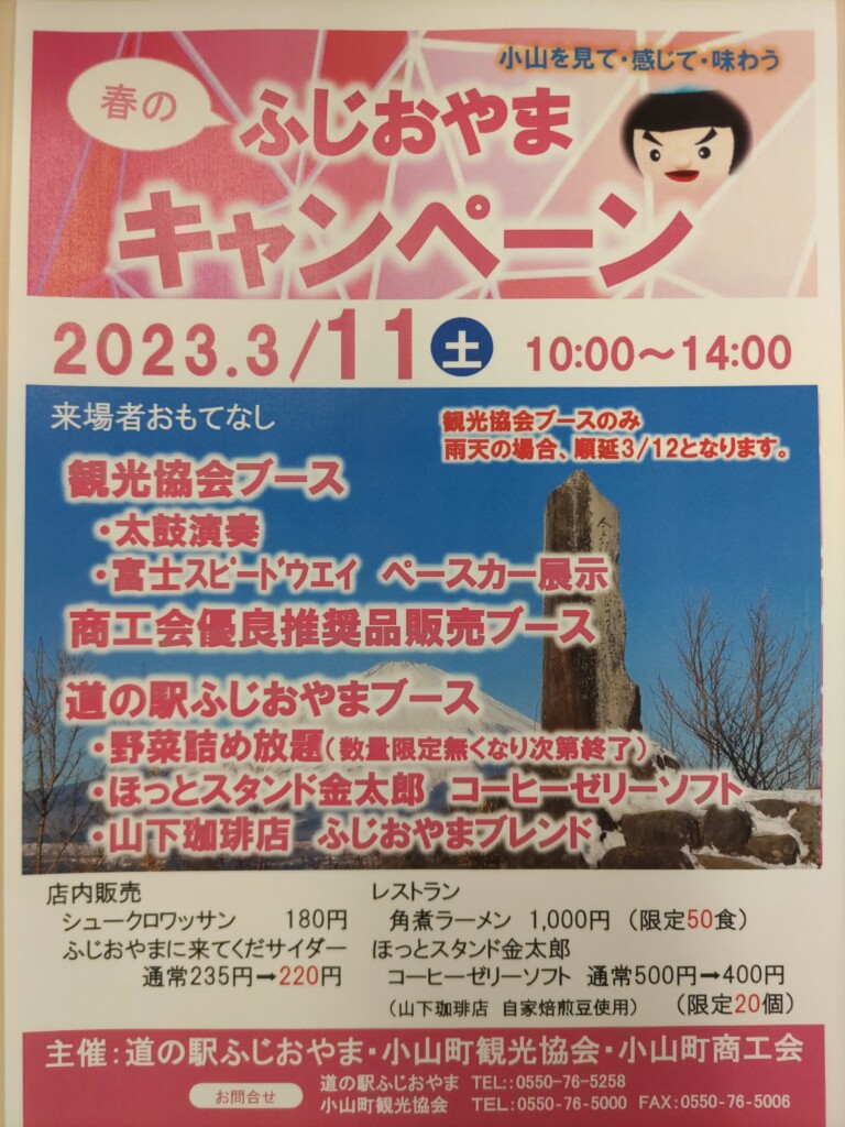 - 小山町観光協会・道の駅ふじおやま・小山町商工会の共催で、「道の駅ふじおやま」にてふじおやまキャンペーンを開催します。