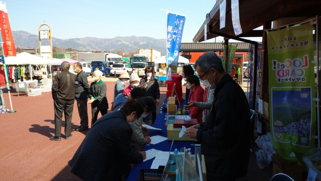 • 令和4年3月12日(土)に道の駅ふじおやまにて、ふじおやまキャンペーンが開催されました。当日は天候も良く、”アンケートに答えてガラポン抽選会”には、たくさんの方々にご参加いただき、景品の小山町特産品に皆さん笑顔がこぼれていました。また、”富士山のポストカード無料配布”も人気で、10種類の中からお好きなカードをお持ち帰りいただきました。メッセージを書いて投函された方のポストカードは、金太郎郵便局で風景印を押して発送させていただきました。盛況のうちに終えることができました。ありがとうございました。