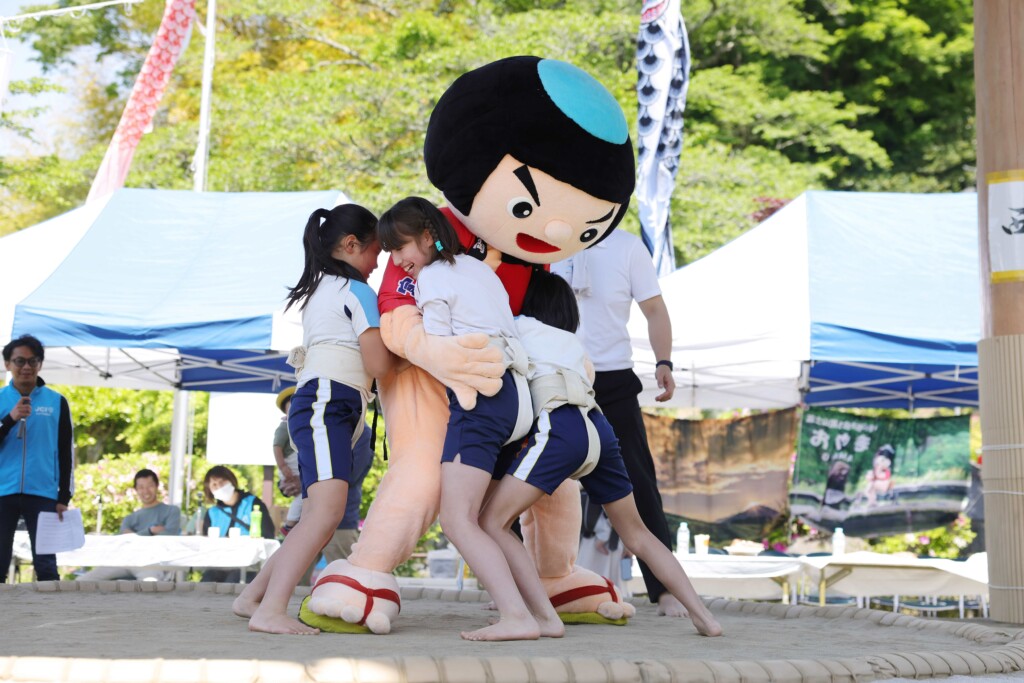 • 晴天の中、わんぱく相撲、こども綱引きでは、子どもたちの元気な姿をみることができました。元力士の磋牙司、飛龍高校の相撲部員も見えられ、盛り上げてくれていました。新入学児健康祈願、妊産婦健康祈願、昔ながらの遊びなどの催しも行われました。色々なお店もでていて、にぎわっていました。
