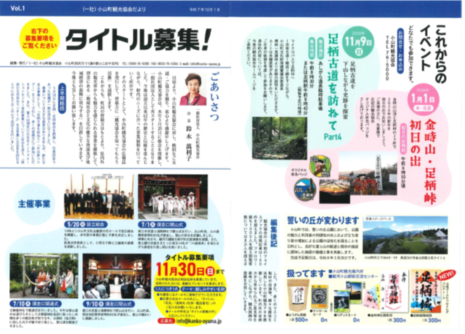 2025年11月4日 小山町観光協会広報誌タイトル募集 2025年10月に、小山町観光協会だよりを創刊しました。ただいま、この広報誌の名称を募集しています。採用された方には、素敵なプレゼントを進呈いたします。応募お待ちしております! <募集要項> 〇1人につき1点 〇テーマ:親しみやすい名称 〇応募方法:メールのみ メールの件名:「タイトル募集の件」 記入内容:「タイトル」「氏名」「連絡先(住所・電話番号)」 〇応募先:info@kanko-oyama.jp 〇応募締切:2025年11月30日(日)まで 前の記事へ
