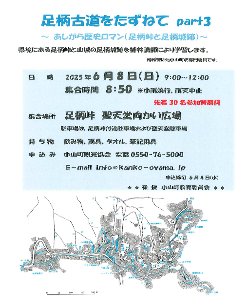 - 足柄古道をたずねてpart3を開催します!今回は、元小山町史専門委員の榑林様を講師にお招きし、県境にあります足柄峠と山城の足柄城跡を学習します。